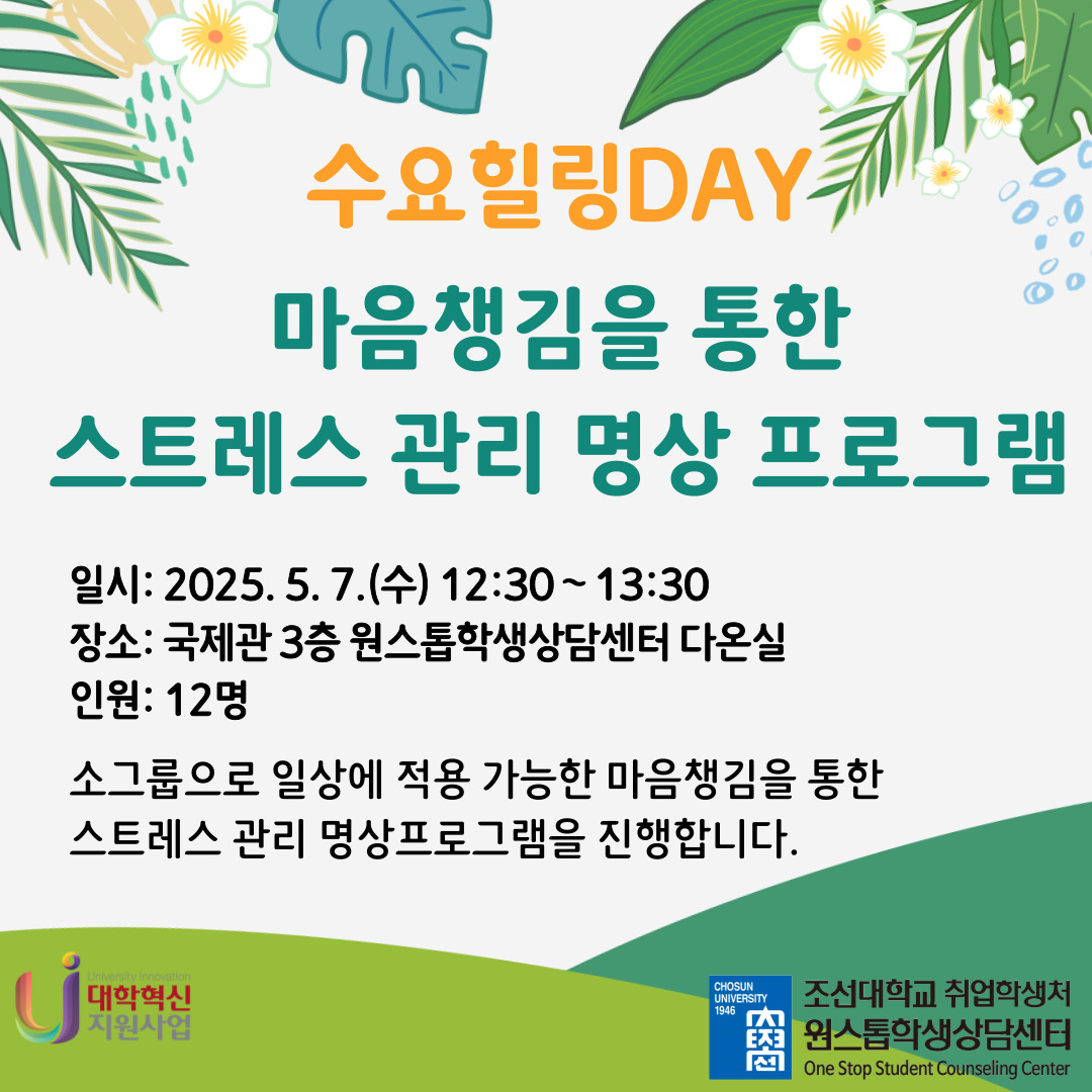 1학기 수요힐링 DAY – ‘마음챙김을 통한 스트레스 관리’ 명상프로그램 안내